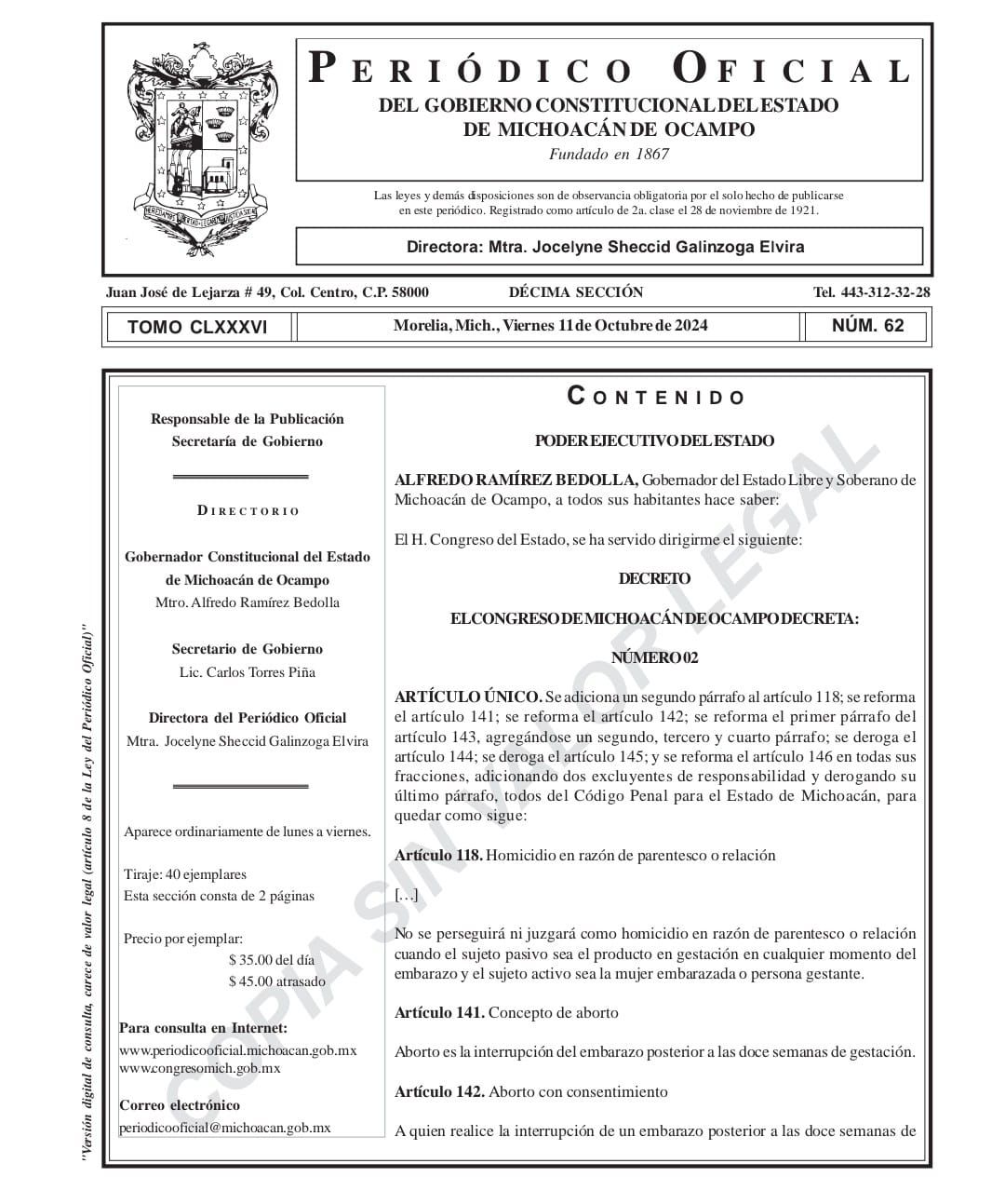 Morelia, Michoacán, a 12 de octubre de 2024.- Este sábado entró en vigor la reforma que despenaliza el aborto en Michoacán a partir de su publicación en el Periódico Oficial del Estado. Con la firma del ... Leer más >>