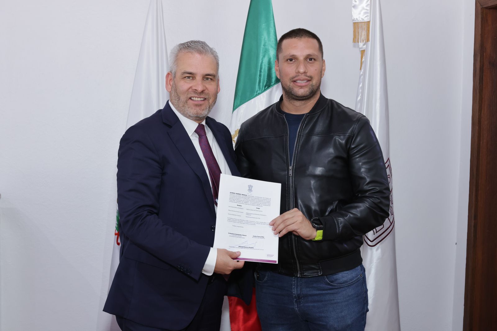 Morelia, Michoacán, a 02 de julio de 2024.- Tras entregar el nombramiento a Lenin López García como director general del Instituto de la Juventud Michoacana (Ijumich), el mandatario Alfredo Ramírez Bedolla lo exhort&o ... Leer más >>