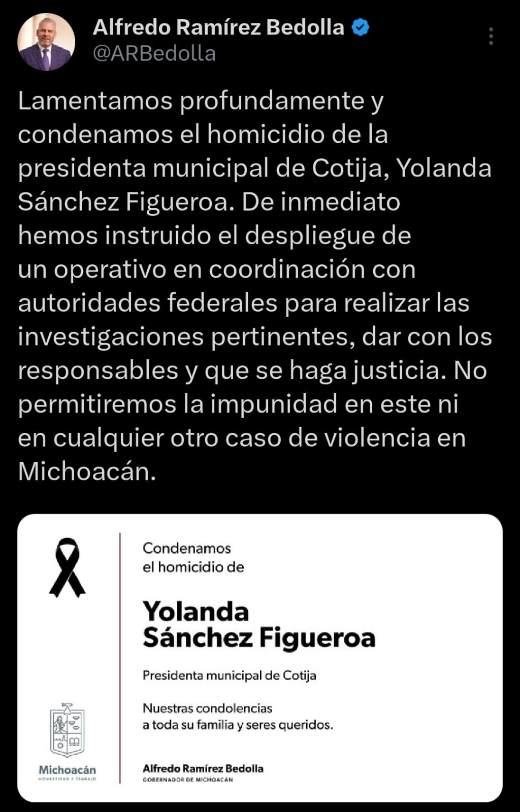 No habrá impunidad tras atentado mortal de presidenta de Cotija: Gobernador de Michoacán