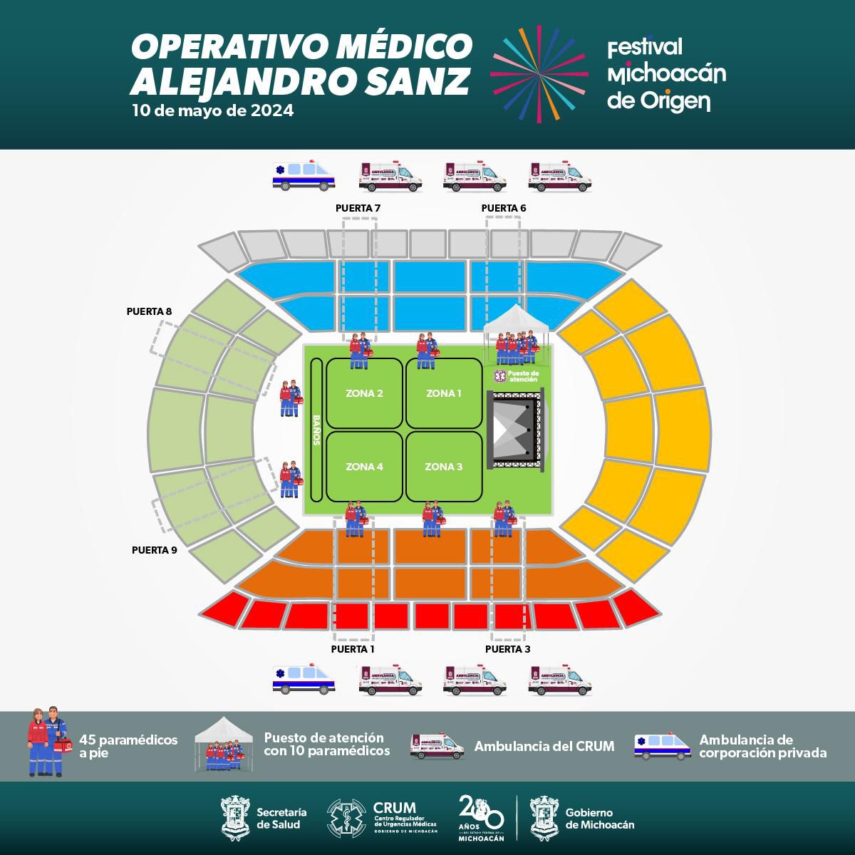 Morelia, Michoacán, a 10 de mayo de 2024 .- La Secretaría de Salud de Michoacán (SSM) mantendrá garantizada la atención médica en el concierto de Alejandro Sanz, con el despliegue de 45 paramédicos y oc ... Leer más >>