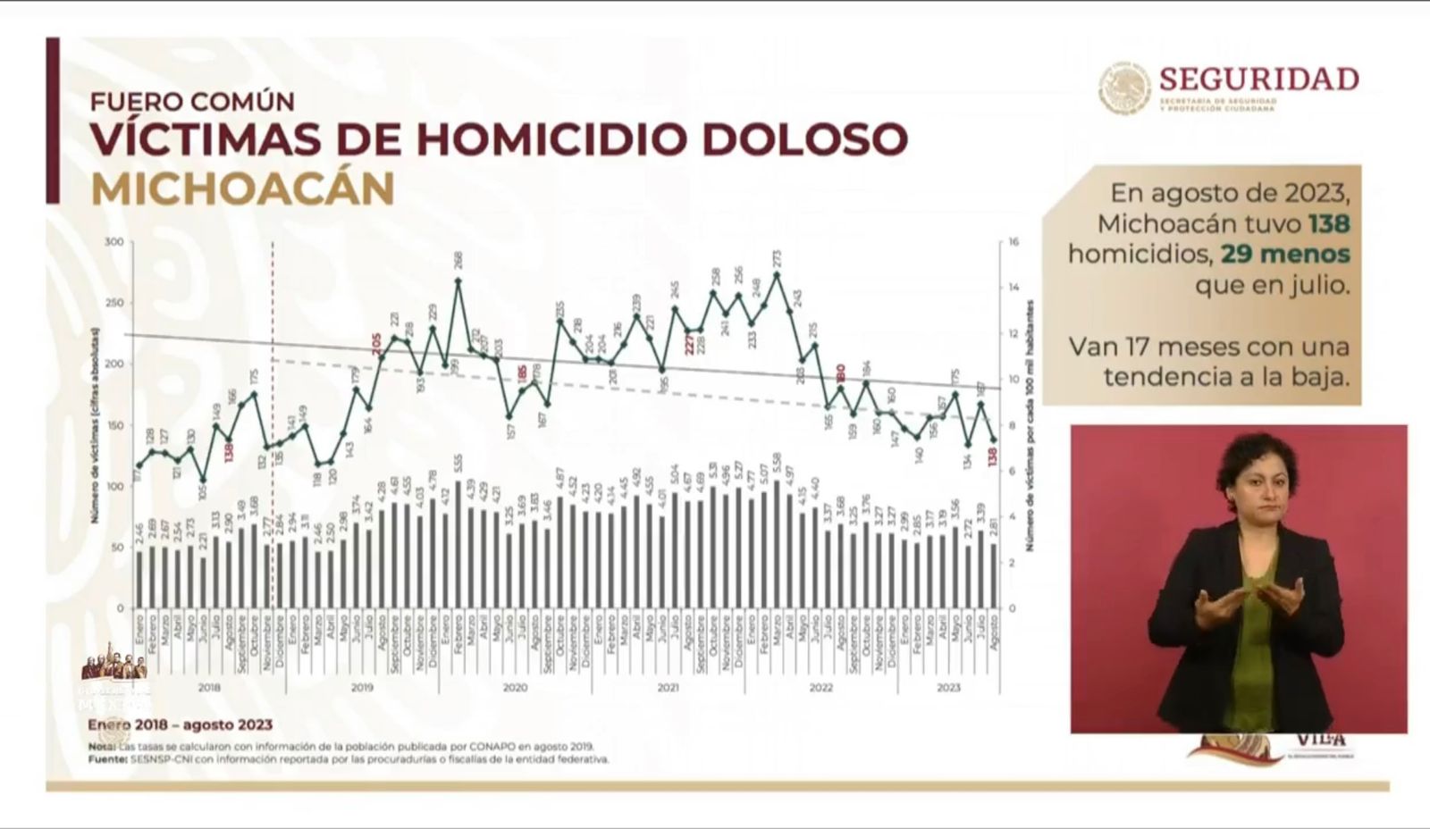 Morelia, Michoacán, a 19 de septiembre de 2023.- El Gobierno federal reportó que Michoacán suma 17 meses con tendencia a la baja en el homicidio doloso, disminución que obedece a la coordinación interinstitucional, afirm& ... Leer más >>