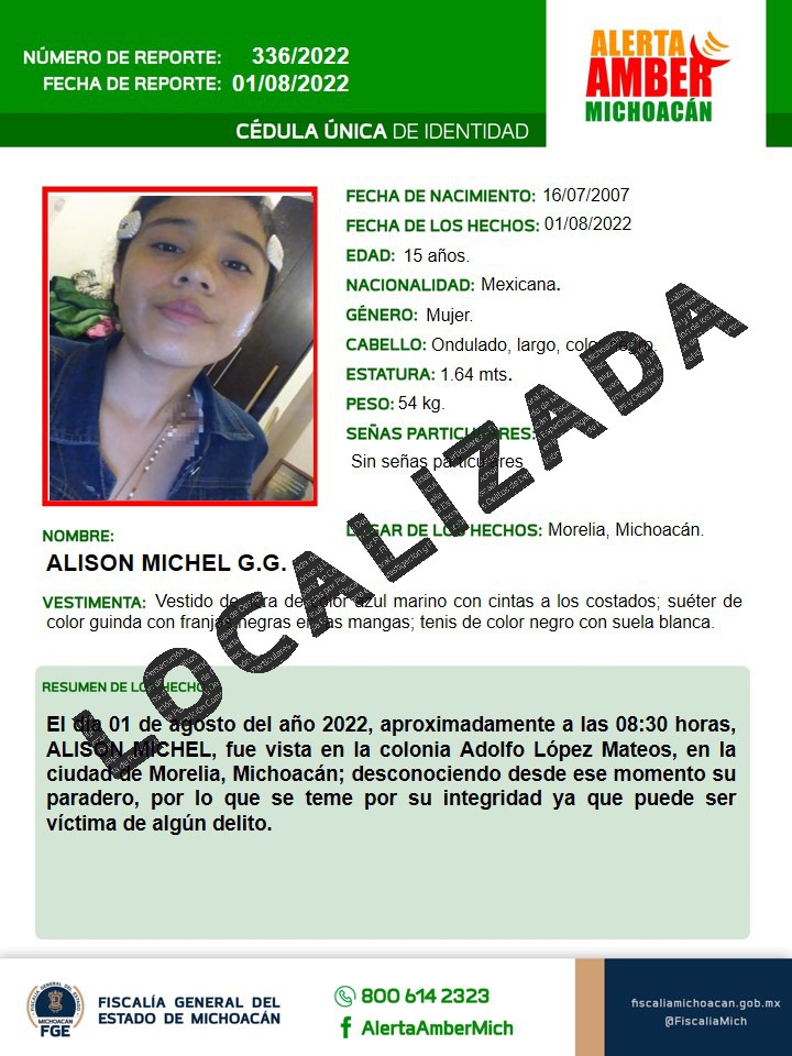 Morelia, Michoacán, a 02 de agosto de 2022.- Labores de investigación realizadas por la Fiscalía General del Estado de Michoacán (FGE) permitieron localizar con bien a A.M.G.G., de 15 años de edad, quien fue reportada ... Leer más >>