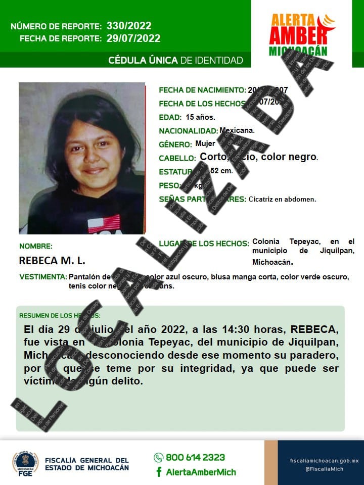 Localiza Fiscalía General a adolescente reportada como desaparecida en Jiquilpan; desactiva Alerta Amber