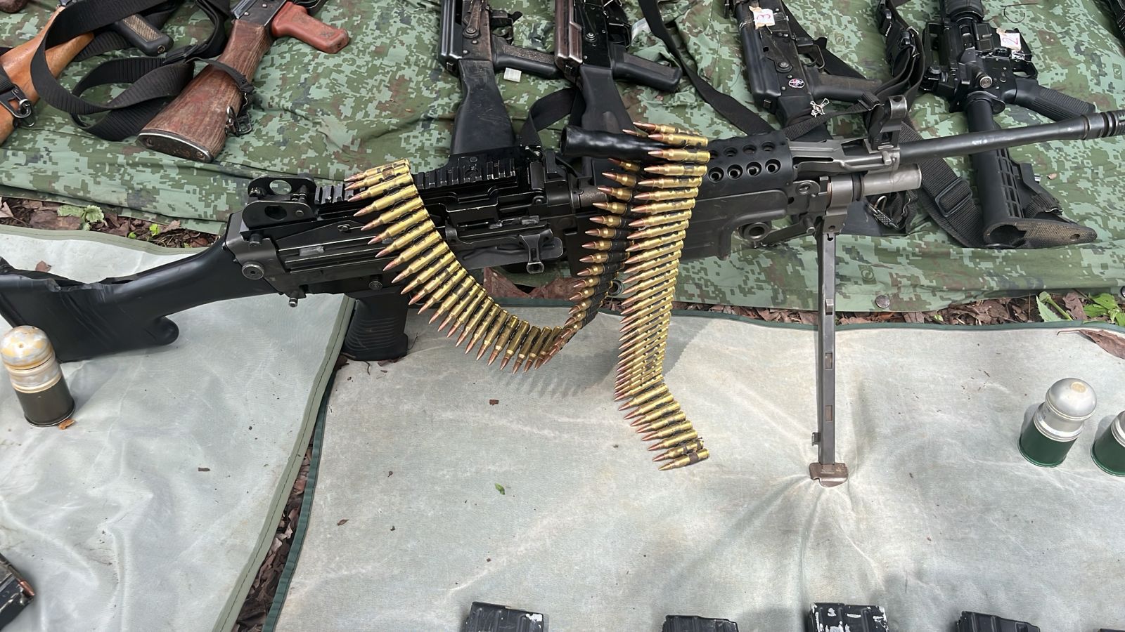 Uruapan, Michoacán, a 03 de octubre de 2025.- Elementos de las secretarías de Seguridad Pública (SSP) y de la Defensa Nacional (Defensa) aseguraron una ametralladora, ocho fusiles, cuatro granadas de aditamento, droga y veh&ia ... Leer más >>