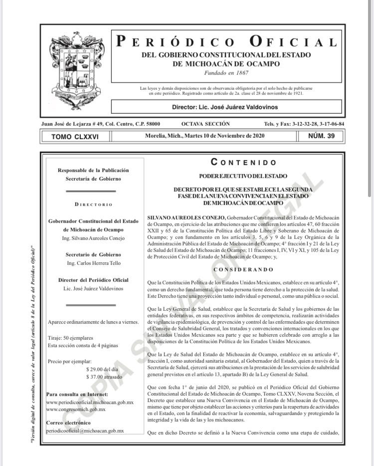 Morelia, Michoacán, a 11 de noviembre de 2020.- El Gobierno del Estado, que encabeza el Gobernador Silvano Aureoles Conejo, publicó el decreto que establece la segunda fase de la Nueva Convivencia, el cual tiene por objeto la aplicació ... Leer más >>