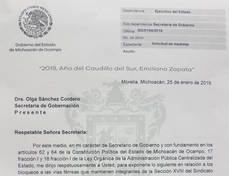 Morelia, Mich., 26 de enero 2019.- El Gobierno de Michoacán solicitó de manera formal al Gobierno de la República la liberación de las vías férreas, las cuales cumplen hoy 12 días obstru ... Leer más >>