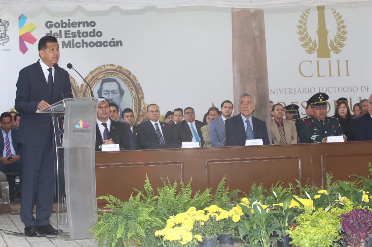 Uruapan, Mich., 21 de octubre 2018.- Autoridades estatales, federales y municipales, representantes de los Poderes Legislativo, Ejecutivo y Judicial, encabezaron este domingo la ceremonia por el CLIII Aniversario Luctuoso de los Má ... Leer más >>