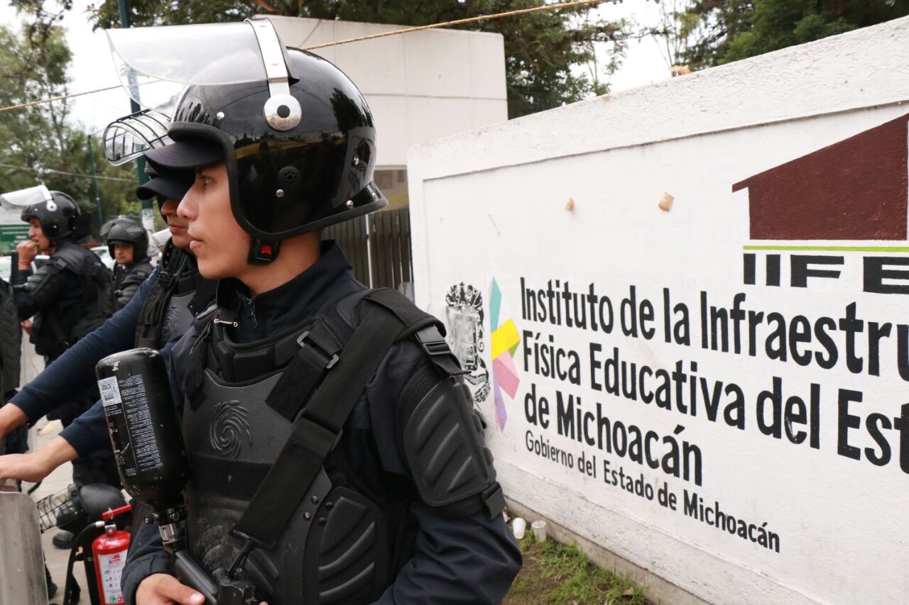 Morelia, Mich., 4 de octubre 2017.- Con el despliegue de agentes de la Unidad de Restablecimiento del Orden Público (UROP), la Secretaría de Seguridad Pública (SSP) resguarda las instalaciones del Instituto de Infra ... Leer más >>