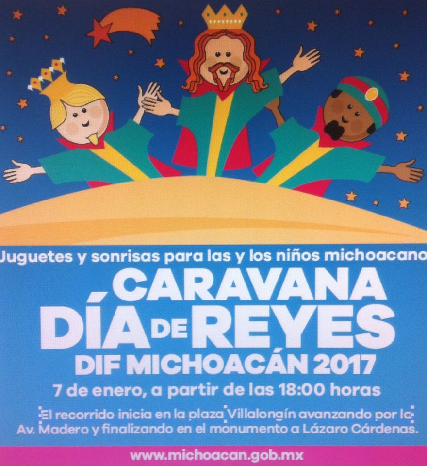 Morelia, Mich., 7 de enero de 2017.- El Sistema para el Desarrollo Integral de la Familia (DIF) Michoacán invita a la Caravana de Día de Reyes 2017, la cual se realizaráhoy a partir de las 18:00horas e iniciar& ... Leer más >>