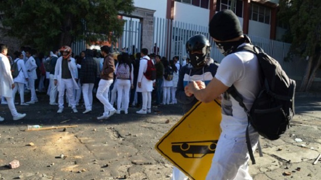 Estudiantes se enfrentan en Morelia; hay seis lesionados y una policía golpeada