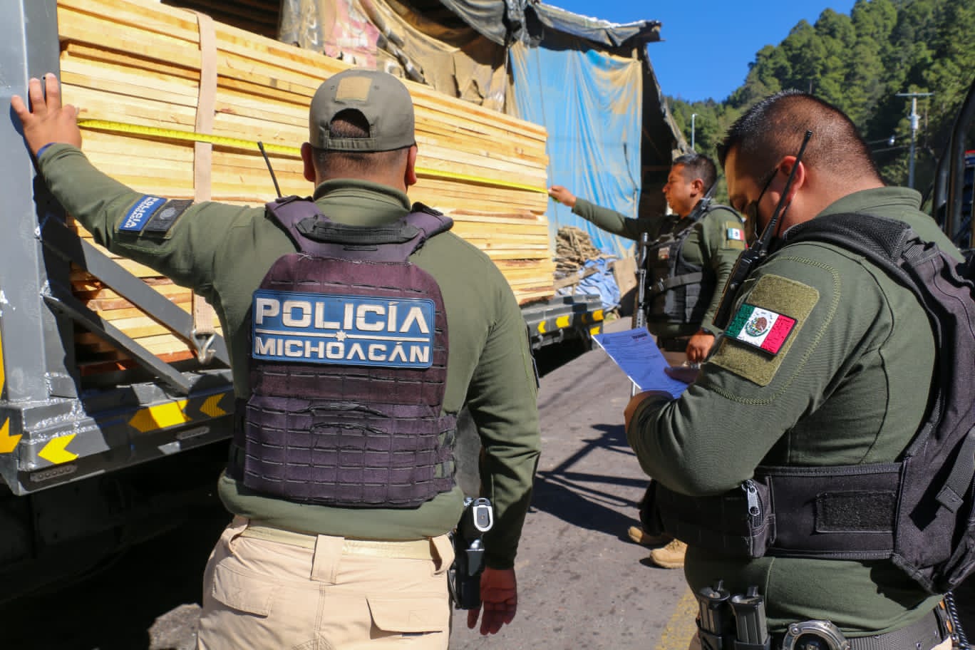SSP asegura camión con madera ilegal, en Zitácuaro