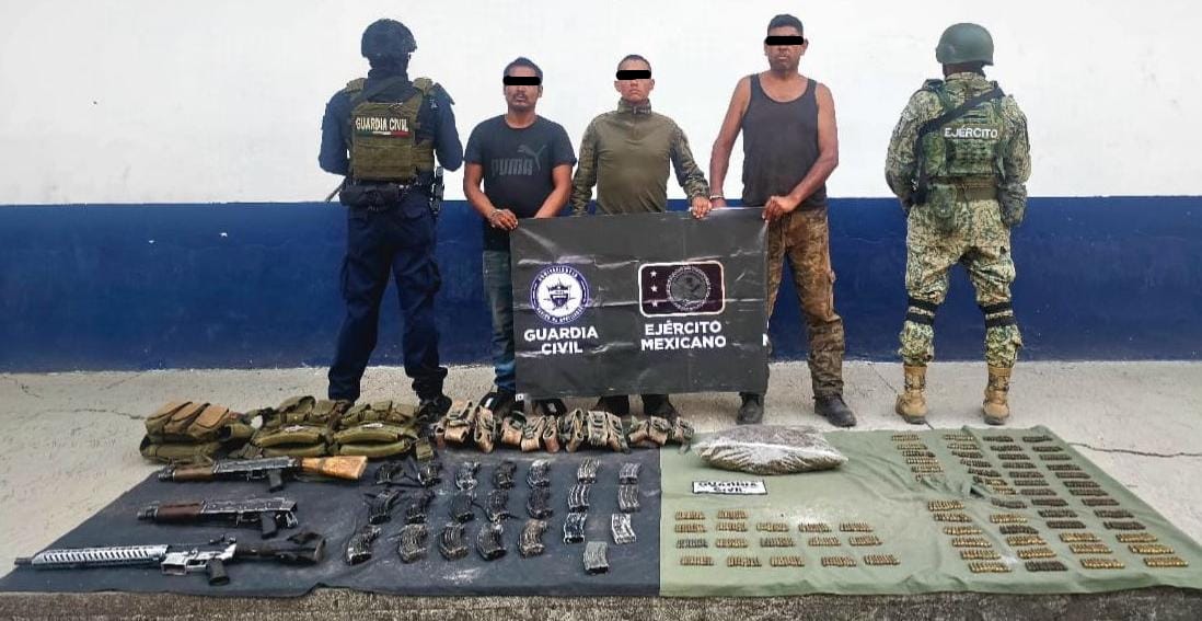 SSP y Defensa detienen a tres hombres, aseguran armamento y droga