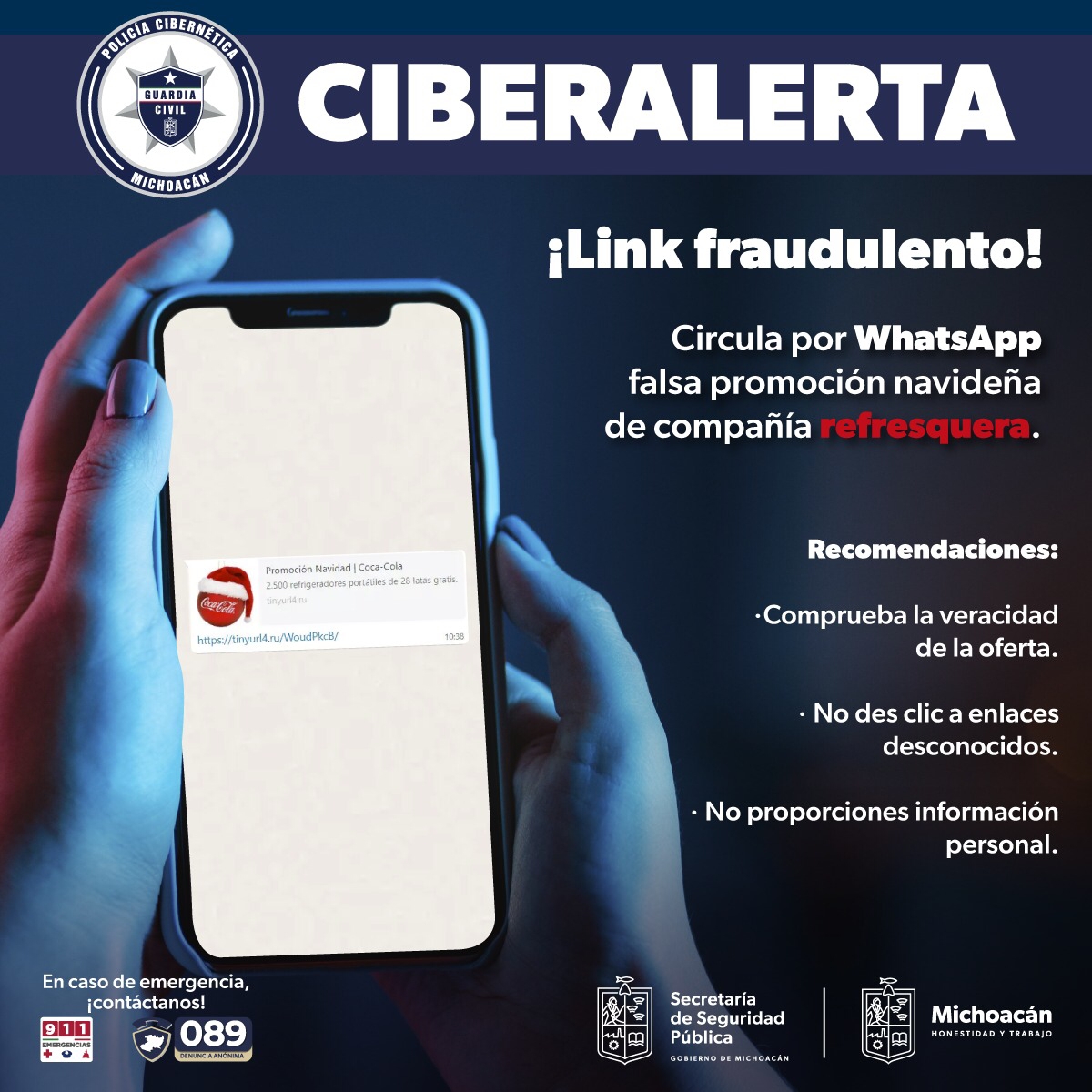 Morelia, Michoacán, a 21 de diciembre de 2022.- Debido a un malware que ronda en las redes sociales, sobre una promoción navideña de la empresa refresquera Coca-Cola y que puede vulnerar gravemente la privacidad de las y los michoacan ... Leer más >>