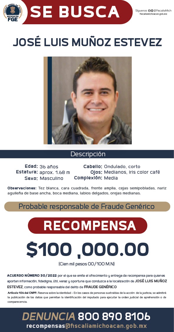 Ofrece Fiscalía recompensa para la detención de presunto responsable de fraude genérico