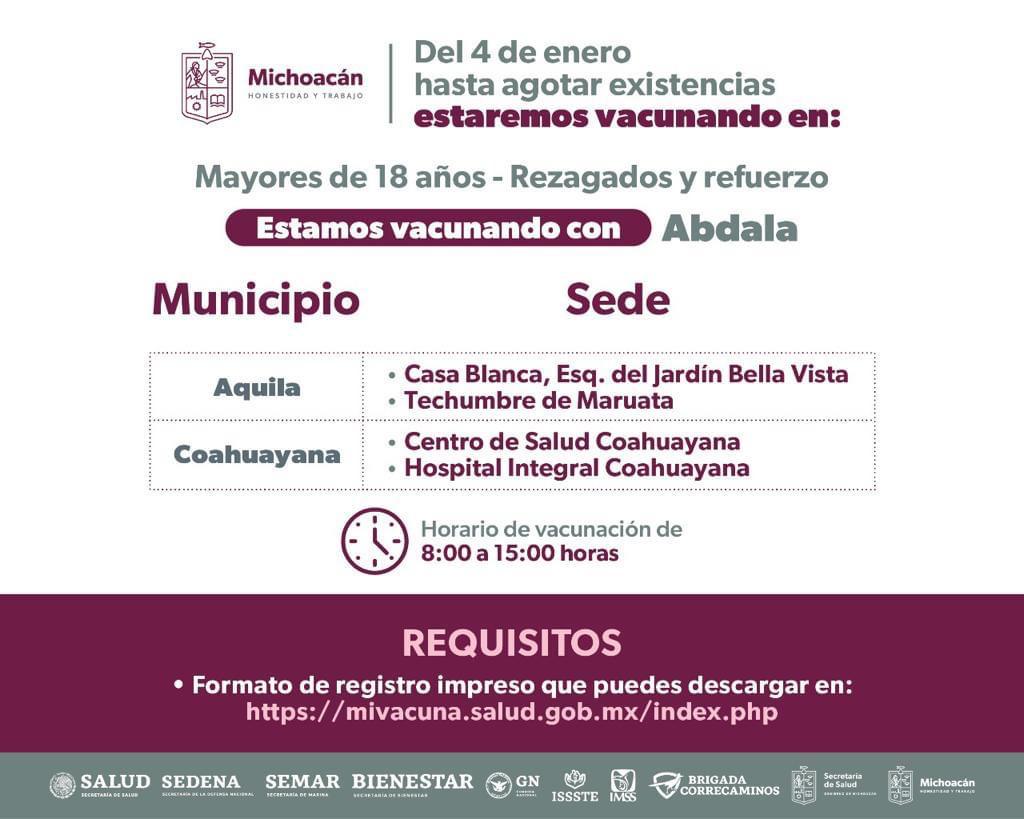 Morelia, Michoacán, a 21 de enero de 2023.- Continuará la vacunación anti COVID-19 en Michoacán para mayores de 18 años de primera dosis, rezagados y refuerzo hasta el 31 de enero con vacuna Abdala en 68 municipios.E ... Leer más >>