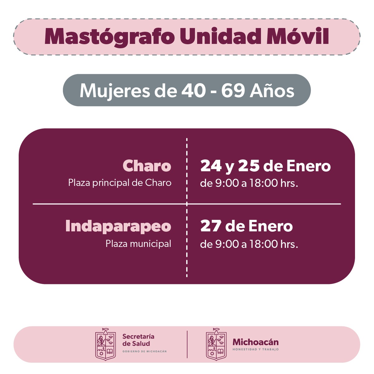 Morelia, Michoacán, a 23 de enero de 2023 .- Del 24 al 27 de enero, la Secretaría de Salud de Michoacán (SSM) realizará mastografías gratuitas a mujeres de entre 40 a 69 años de edad en los municipios de Charo ... Leer más >>