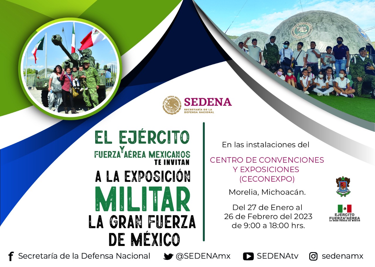 Morelia, Michoacán, a 23 de enero de 2023 .- Del 27 de enero al 26 de febrero, el Centro de Convenciones y Exposiciones de Morelia (Ceconexpo) recibirá la exposición militar de la Secretaría de la Defensa Nacional (Sedena) " ... Leer más >>