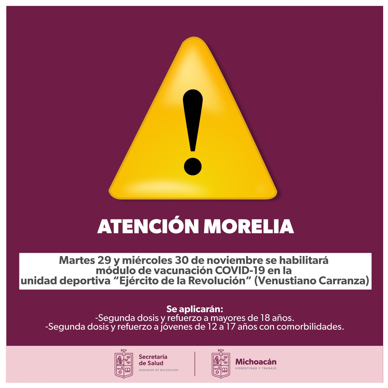 Morelia, Michoacán, a 28 de noviembre de 2022.- La Secretaría de Salud de Michoacán (SSM) invita a todos los mayores de 18 años a acudir al centro de salud más cercano para solicitar su segunda dosis o refuerzo adicional ... Leer más >>