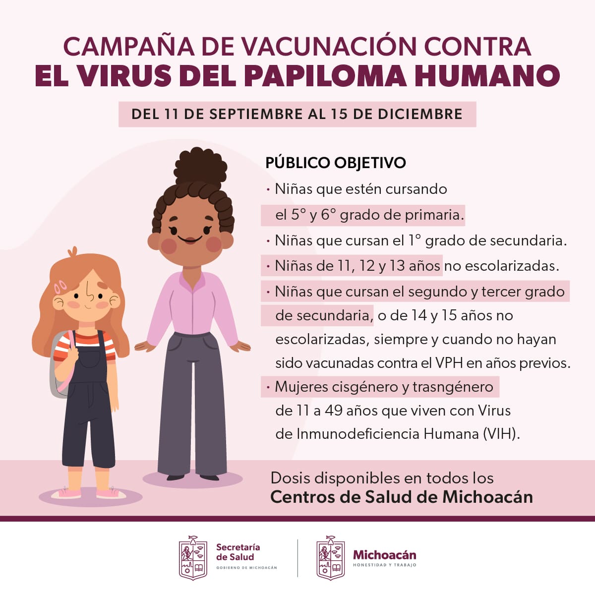Morelia, Michoacán, a 07 de septiembre de 2023.- Con el propósito de mitigar el rezago en esquemas de vacunación contra el Virus del Papiloma Humano (VPH), la Secretaría de Salud de Michoacán (SSM) anuncia a la pobl ... Leer más >>