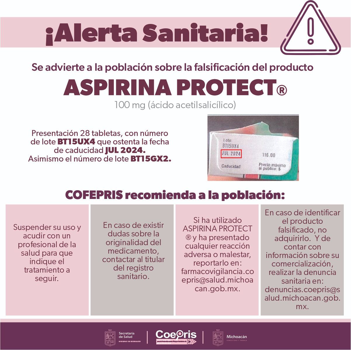 Alerta SSM sobre falsificación de Aspirina Protect