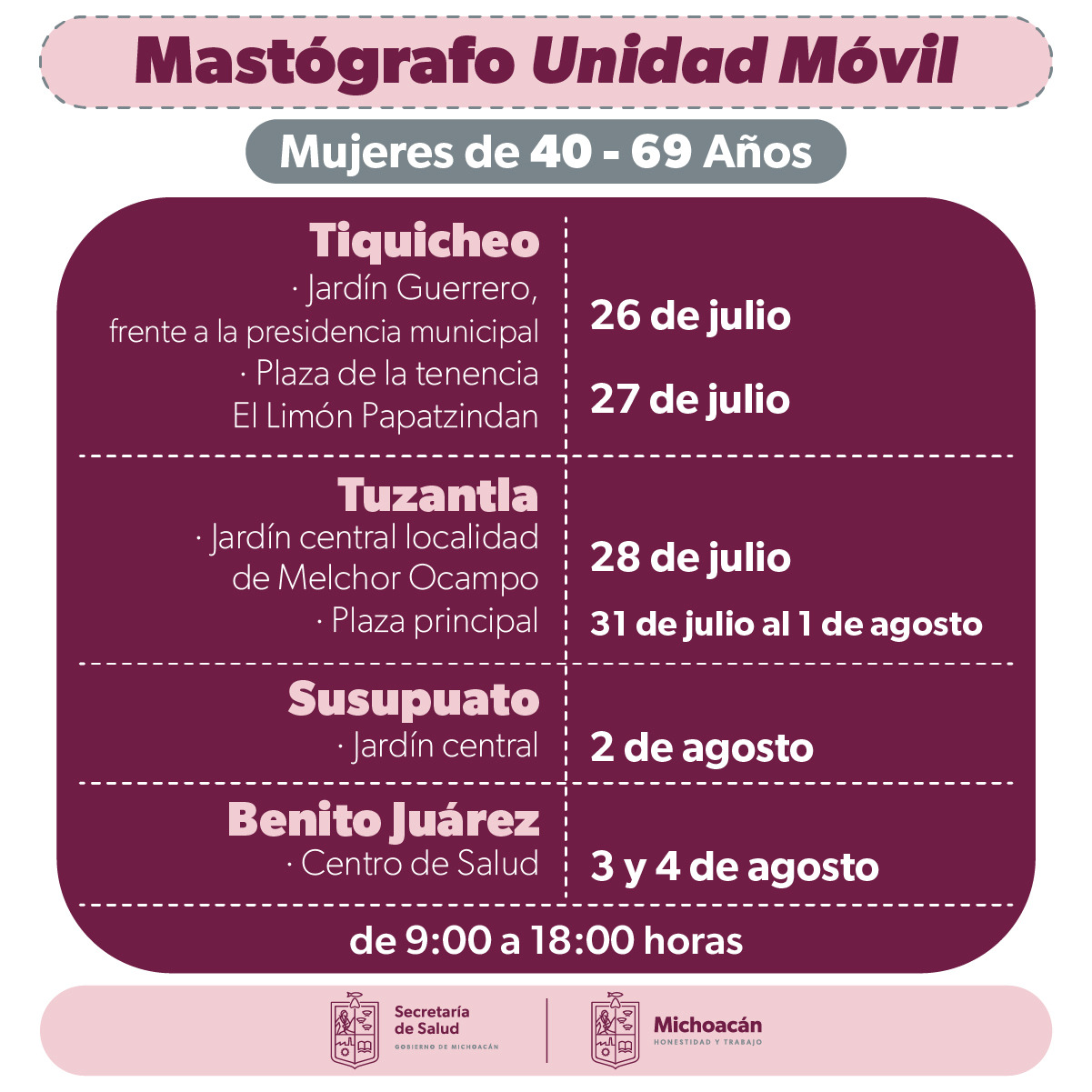 Morelia, Michoacán, a 26 de julio de 2023.- La Secretaría de Salud de Michoacán (SSM) realiza este miércoles mastografías gratuitas en la plaza del Carmen de Morelia, de 9:00 a 17:00 horas. El servicio est ... Leer más >>
