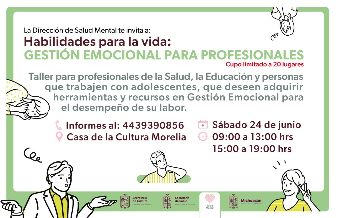 Morelia, Michoacán, a 21 de junio de 2023.- La Secretaría de Salud de Michoacán (SSM) invita a los profesionales de la Salud, Educación y personas que trabajen con adolescentes, al taller Habilidades para la vida: Gesti&oac ... Leer más >>