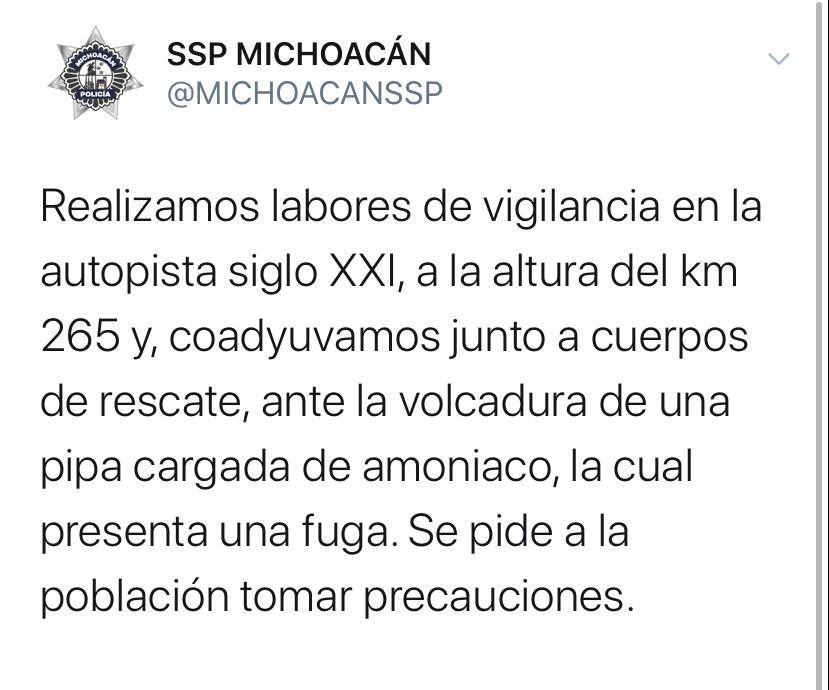 Morelia, Michoacán, a 6 de diciembre de 2019.- Para garantizar la seguridad y la salud de la población, el Gobierno de Michoacán a través de sus distintas instituciones, realiza labores de vigilancia y rescate en la autopista Siglo XXI, a la altura del km. 265, donde se registró la volcadura de una pipa con amoniaco.