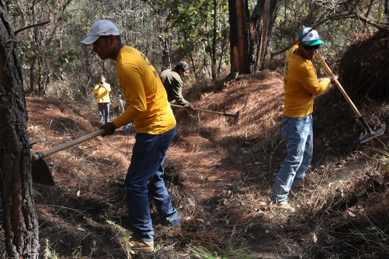 Mientras trabajaban las manos de alrededor de 150 personas en siete hectáreas del predio "El Pinalito", Lemus Ruiz explicó que estas acciones se han reforzado con la participación de mujeres y hombres pre liberados del Sistema Penitenciario del Estado, así como de brigadas especiales de la Cofom y de los Ayuntamientos.